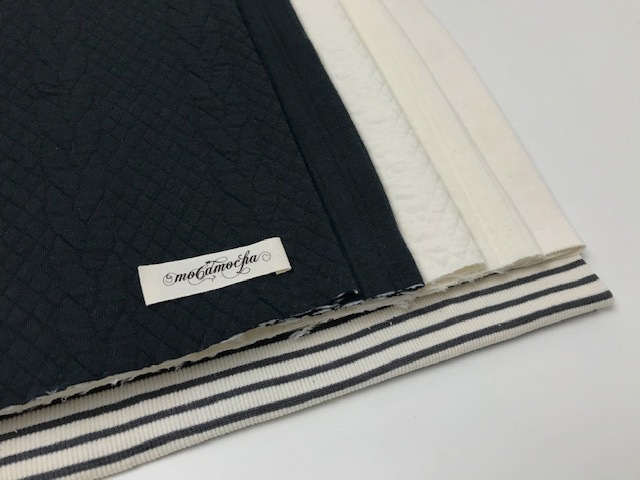 左から、チャコールとエクリュの 縄編み柄キルトニット、ストライプキルトニット、