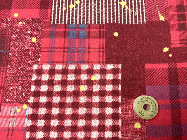 ヴィンテージデニムとチェックのパーツをミックスしたグランジデニムの上にカラーペンキを飛ばしたような、