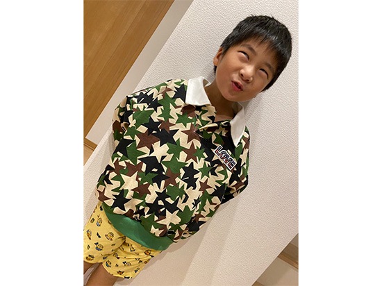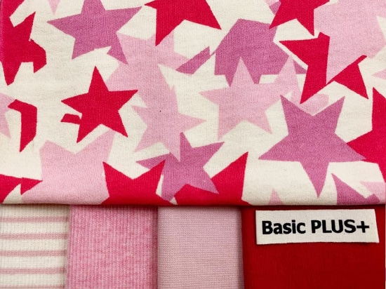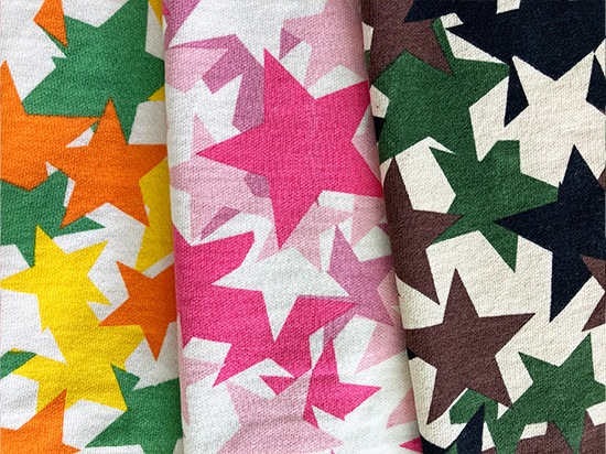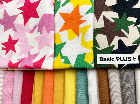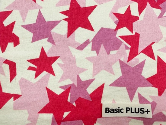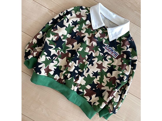 mocamocha/Basic PLUS+の定番のミニ裏毛に星のカモフラージュ柄をプリントし、ミリタリーテイストの格好よさとキュートな雰囲気を合わせ持つ生地に仕上がりました。