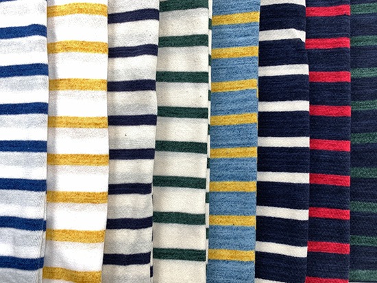 デニムに似た染め方で染めた糸を使用した、天竺のボーダー生地です。