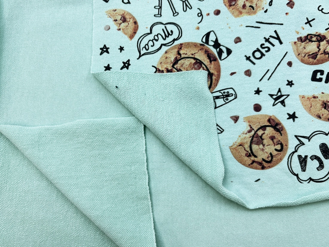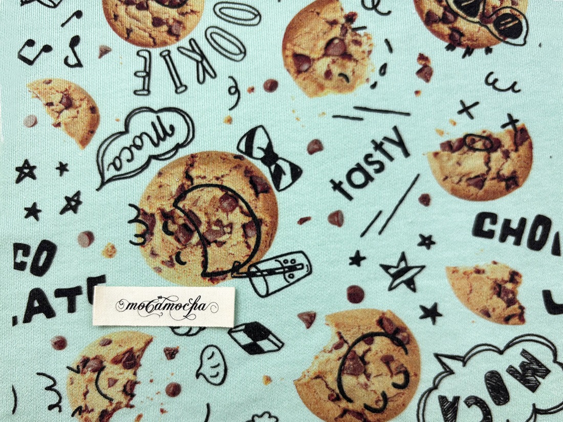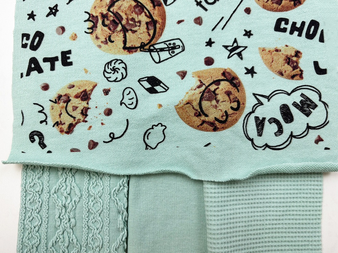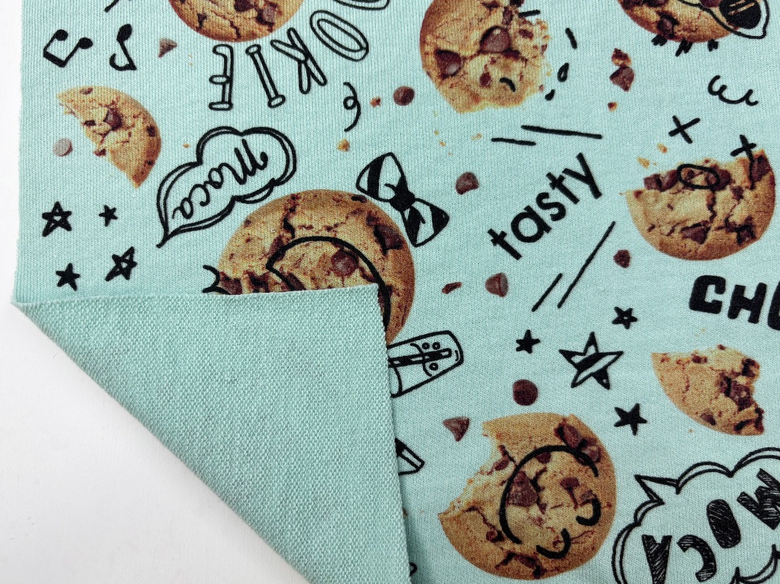 《40/20ミニ裏毛ニット ミント》をベースに、思わず食べたくなるようなまるで本物のチョコチップクッキーが並んだポップで楽しい総柄ニットです。