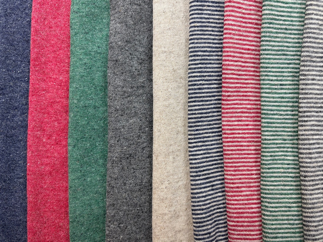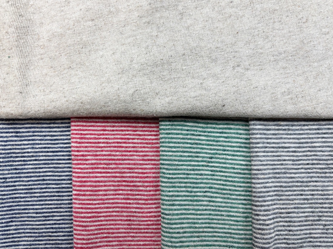 リネンとコットンを合わせたワタを、紡績の段階で色を付けた糸で編み上げた天竺生地です。