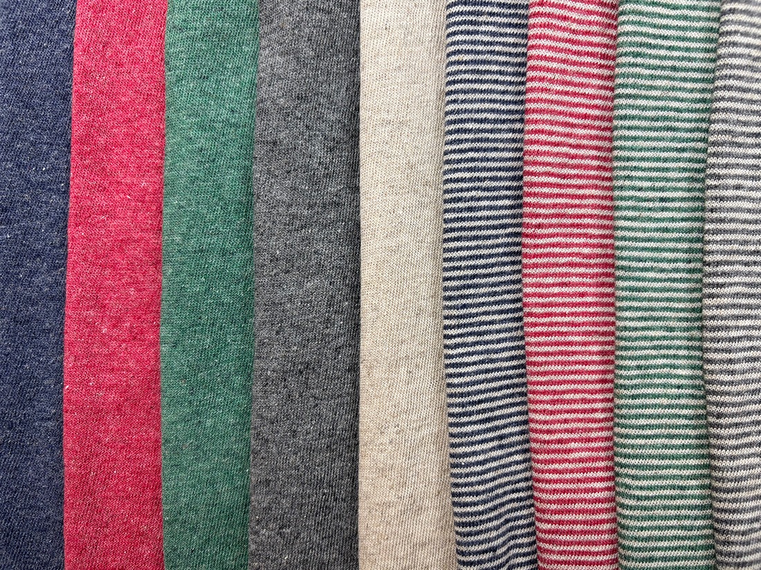 リネンとコットンのワタを合わせ、紡績の段階で色を付けた糸を使用して編み立てているため、
